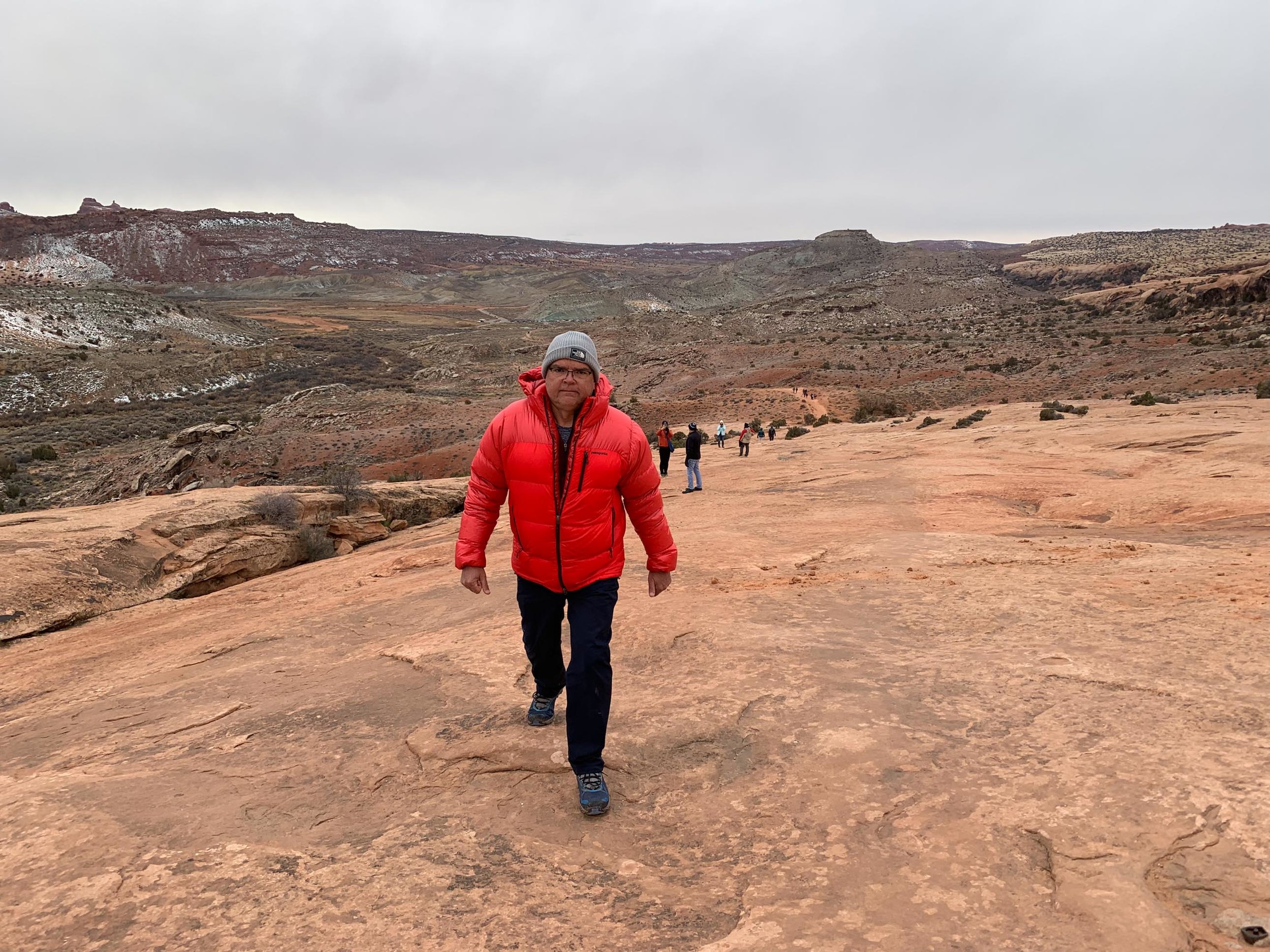 Every summer I keep track of the out-of-state license plates I see in our county. About every other year I’ll find a Hawaii. Rhode Island and North Dakota are the rarest, but one of my favorites is the Utah plate with the red rock arch. Today we — Joe, Josh, Jonah and I — hiked to the iconic spot represented on the Utah plate, Delicate Arch in Arches National Park. The state of Utah stepped in during the federal government shut-down and funded the park’s Visitor Center through the holidays, but we didn’t see any rangers on the trail.